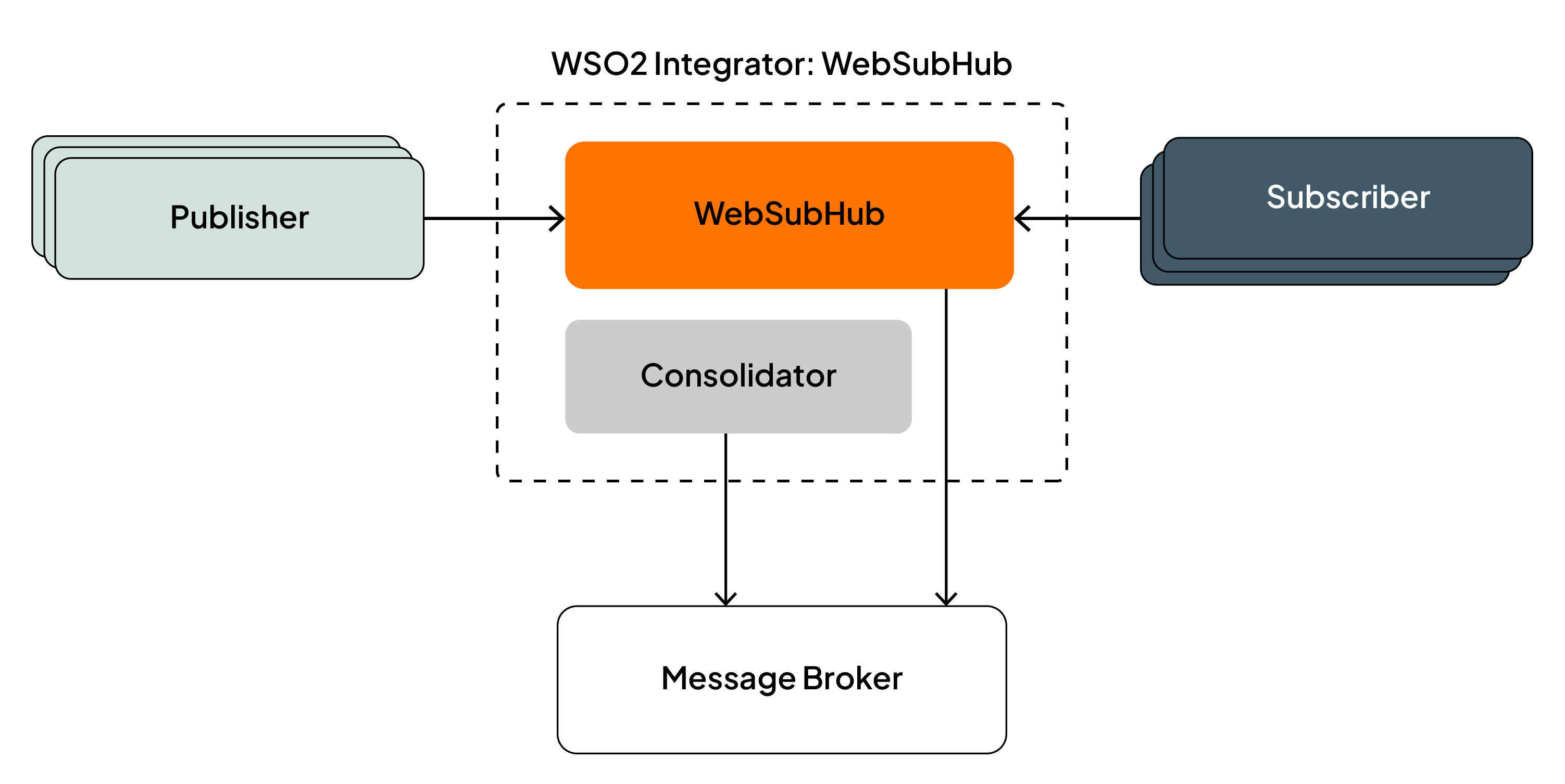 The WSO2 Integrator: WebSubHub distribution is composed of two main components: the WebSubHub and the Consolidator. The WebSubHub is a WebSub-compliant hub implementation that manages topics, processes subscription requests, and delivers content updates to subscribers. The Consolidator is responsible for managing the overall system state.